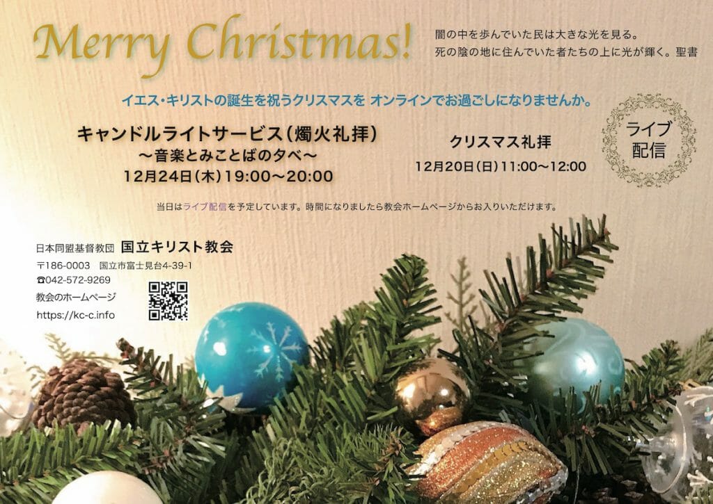 だれも予想しなかった今年のクリスマス、あなたはどのようにお過ごしになりますか。暗闇の中に光として来てくださったイエス・キリストのご誕生を祝うひとときをご一緒にお過ごしになりませんか。クリスマス礼拝とキャンドルライトサービスをオンラインで配信します。このホームページでライブ配信を行いますので、ぜひご視聴ください。詳しいことがお知りになりたい方は教会にご連絡ください。