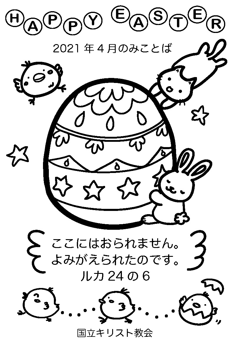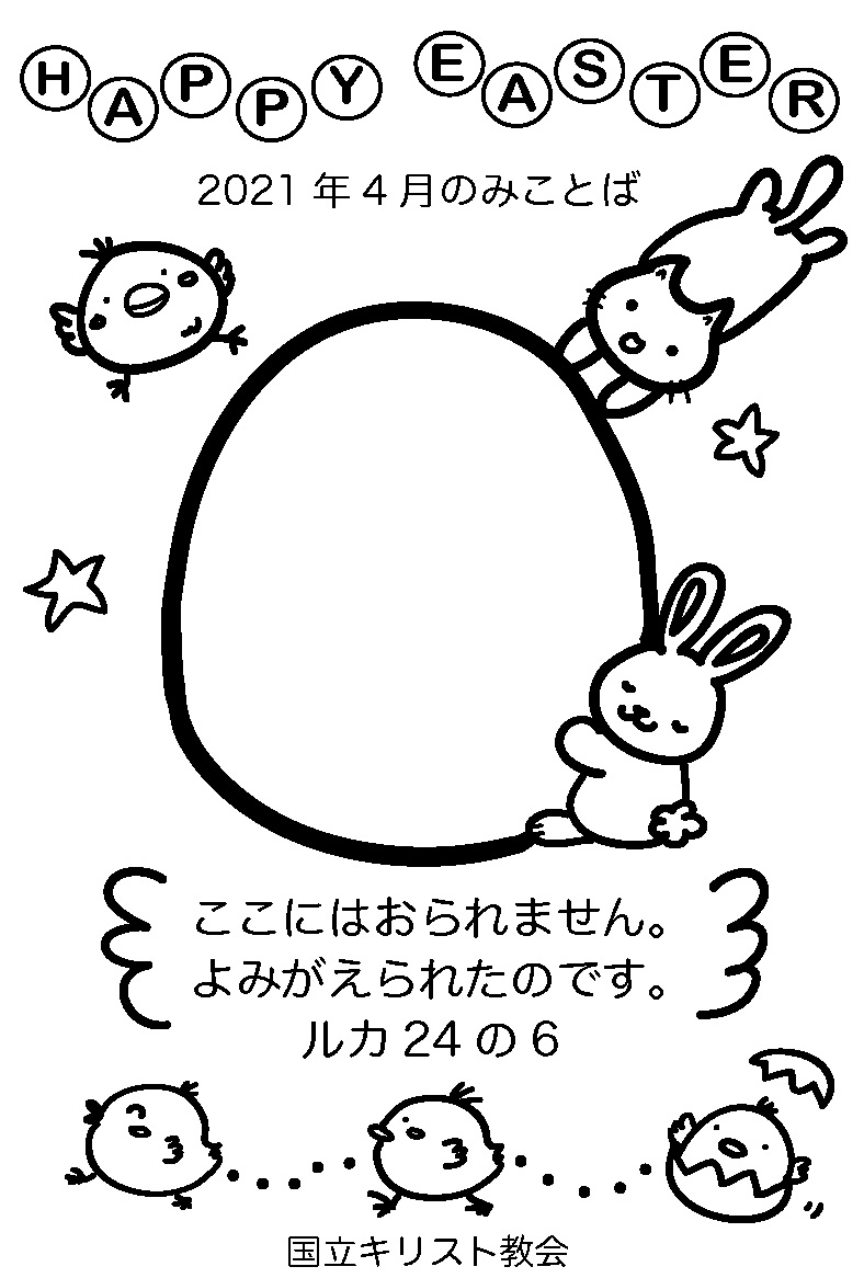 2021年4月1日 / 最終更新日 : 2021年4月2日 kcc@sakuraadmin お知らせ 4月のみことばカード 4月のみことばカードは、イースターエッグ。なにもかいていないたまごにはすきなえをかいてください。がらがついているのはぬってね。どちらでもすきなほうをえらんでください。はがきのサイズのかみにいんさつしてつかってね。